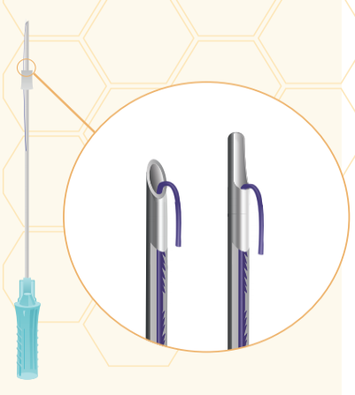 COG 1R представляет собой нить с односторонними сходящимися насечками, заправленную в канюлю.