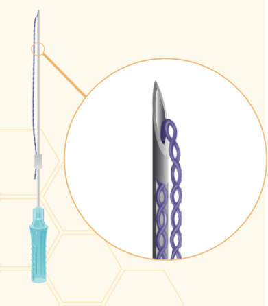 Двойные витые нити ставятся на плотную гиперкератозную кожу. Рекомендуется применять для эффективной коррекции кожи пациентов с деформационно-отечный типом старения.